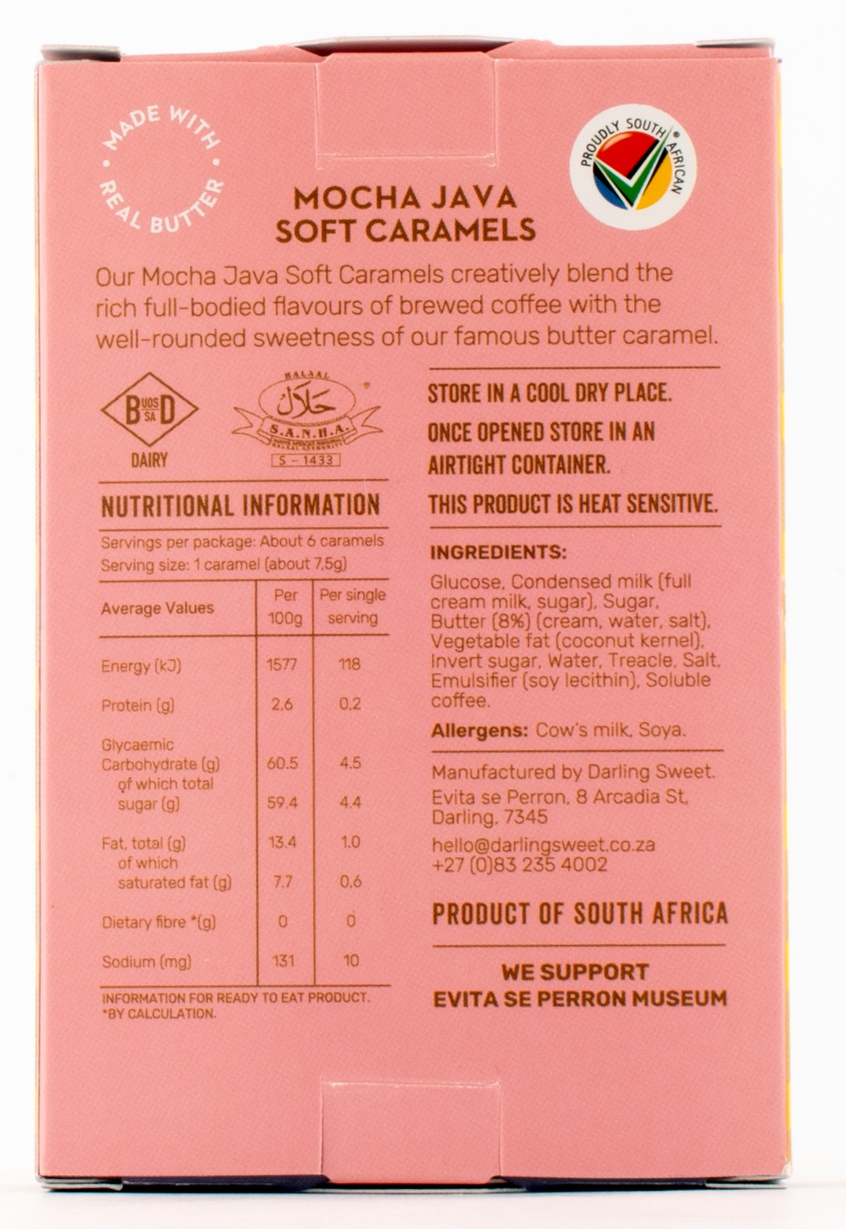 Ingredients: Glucose syrup, Condensed milk (full cream milk, sugar), Sugar, Salted Butter (8%), Invert sugar syrup, Water, Treacle, Vegetable oil (coconut kernel), Salt, Emulsifier (soya lecithin), Soluble coffee.