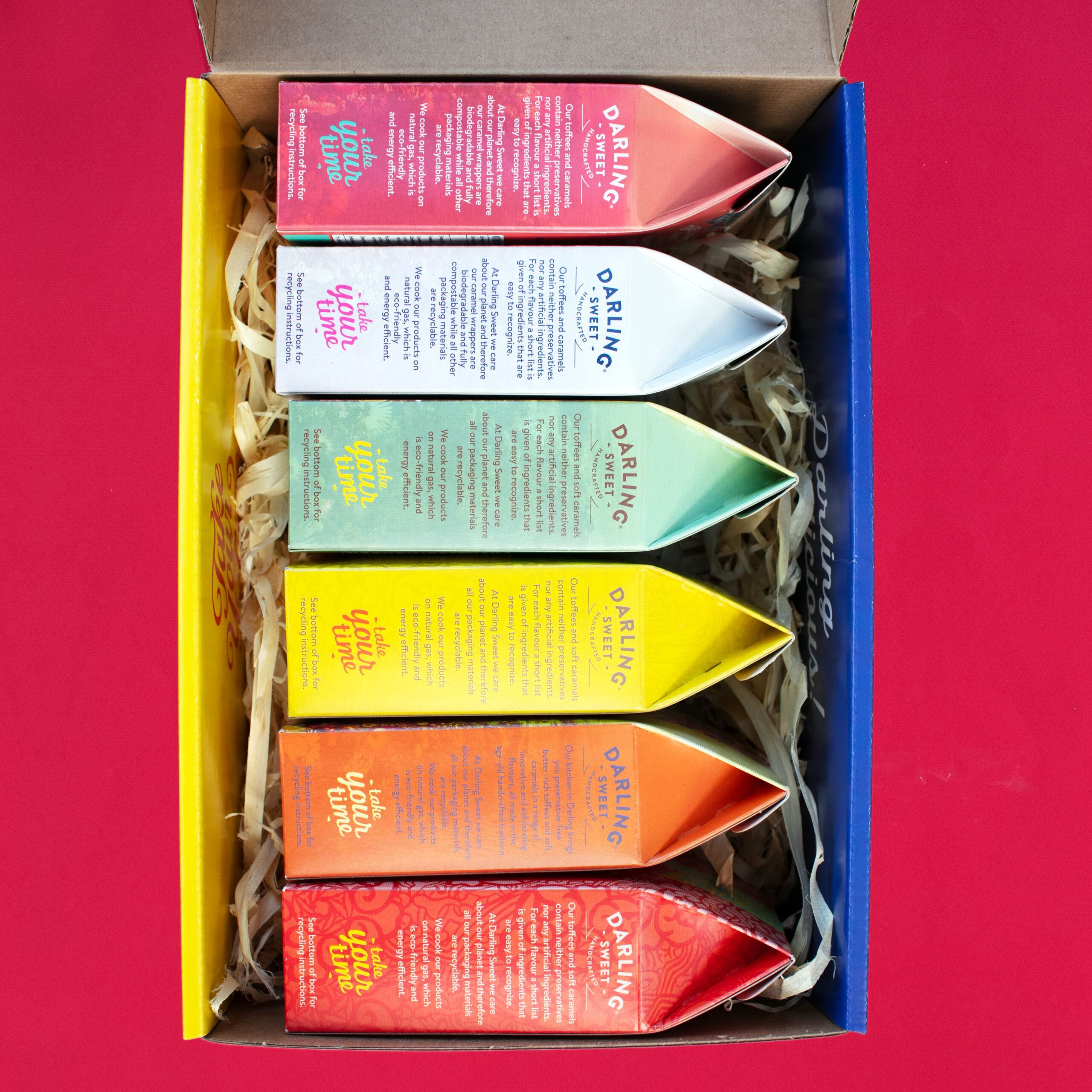 A sweet lover’s dream, featuring six 150g packs of Darling Sweet Toffees or Soft Caramels of your choice. Whether you prefer the comforting richness of our butter-caramel toffees or the melt in your mouth softness of our caramels, this hamper offers the perfect selection for indulgence, celebration, or gifting.