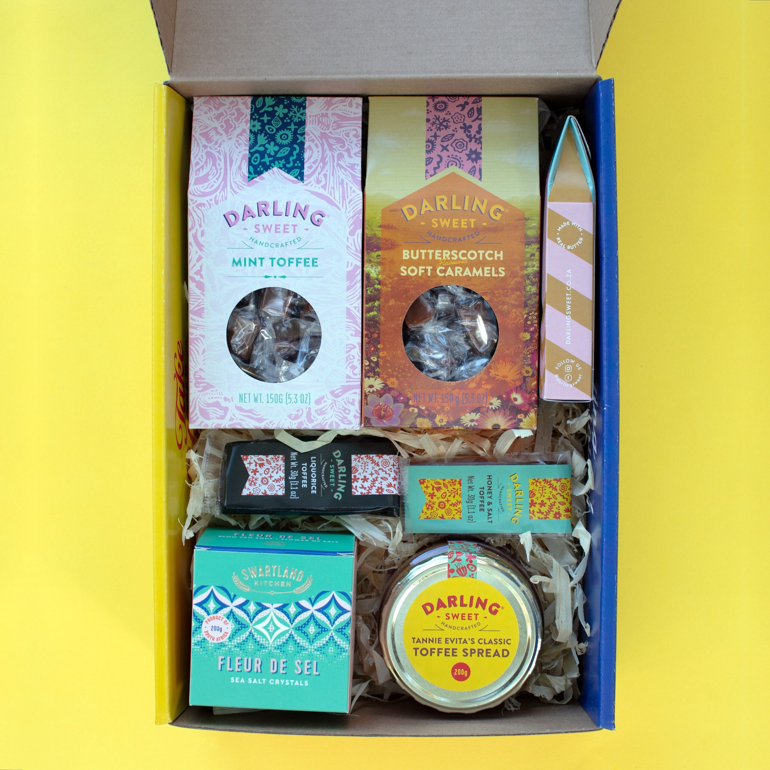 Celebrate the best of Darling Sweet with this Hamper — a luxurious collection of handcrafted confections and pantry delights. This beautifully curated hamper includes two 150g boxes of Darling Sweet Toffees or Soft Caramels of your choice, a 115g portion of Traditional Fudge, a rich and creamy Toffee Spread of your choice, two 30g Toffee Bars for on-the-go indulgence, and a 200g jar of Swartland Kitchen’s artisanal Fleur de Sel.