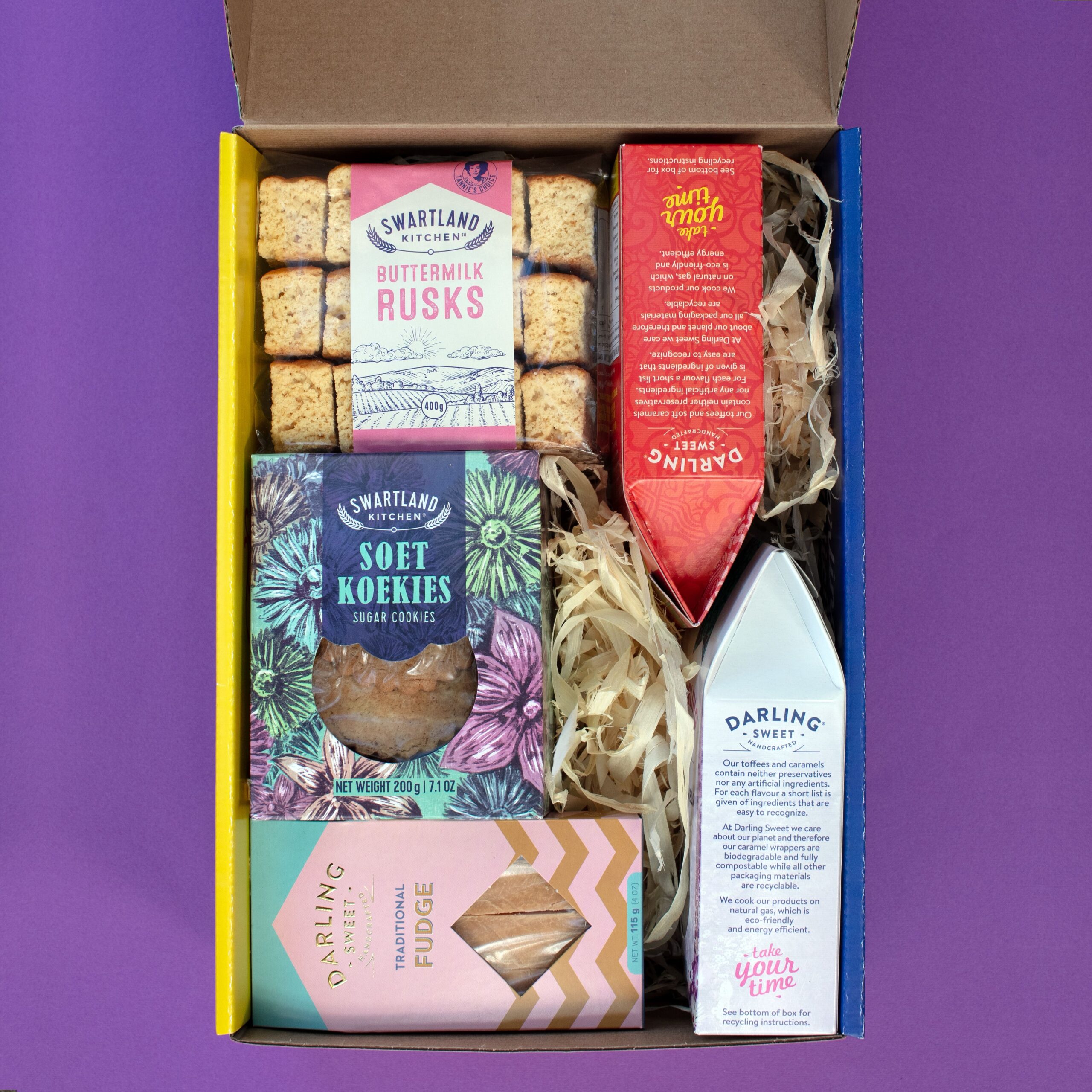 Indulge in our Darling Sweet’s Hamper, a thoughtfully curated gift set combining rich confectionery with traditional baked treats. This hamper includes two 150g boxes of Darling Sweet Toffees or Soft Caramels of your choice, a 115g portion of Traditional Fudge, a 400g selection of Swartland Kitchen Rusks, and a 150g or 200g pack of Swartland Kitchen Cookies of your choice.