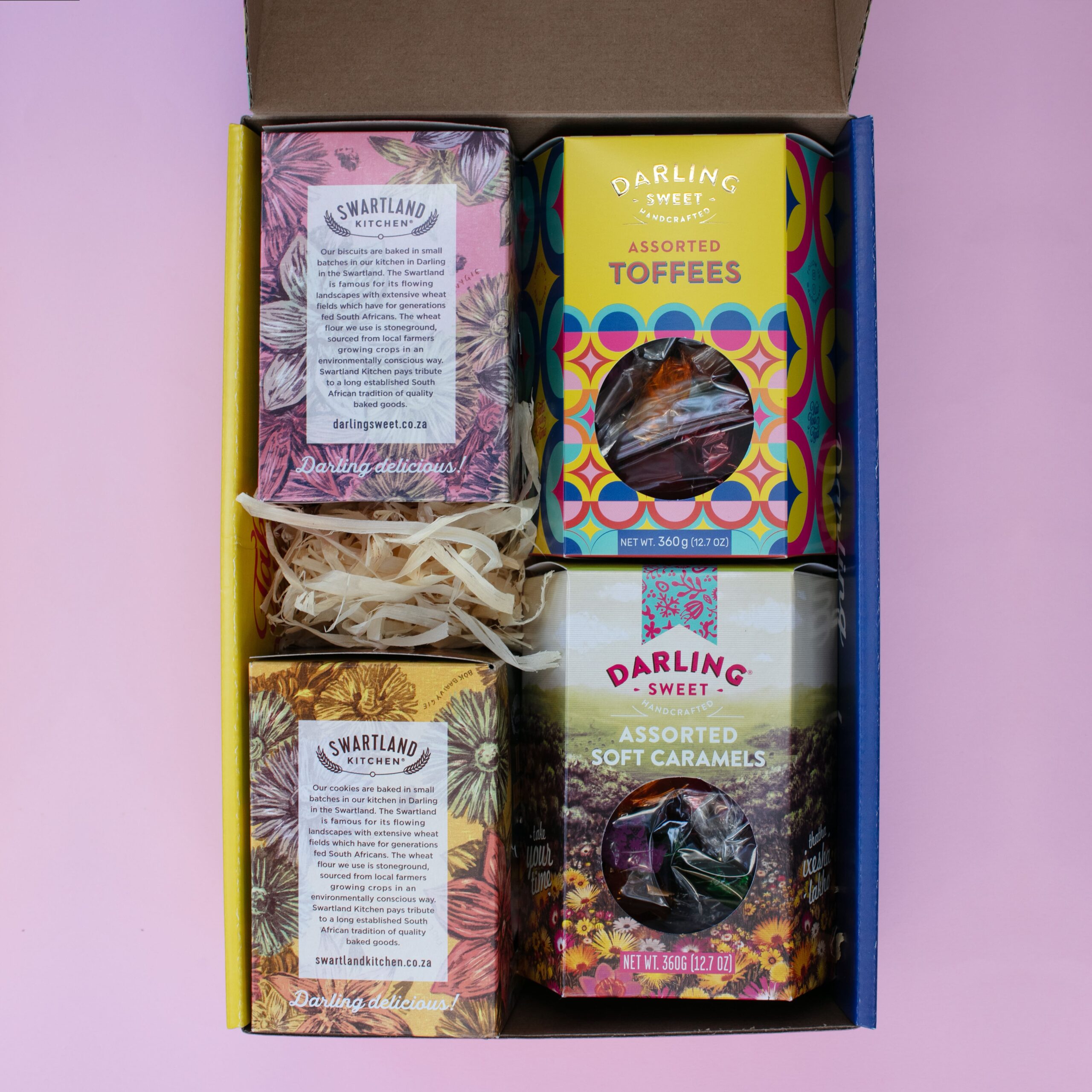 Delight in the rich flavours of the Darling Sweet Hamper, a carefully curated gift set combining indulgent sweets and baked treats. This hamper includes a 360g box of Assorted Soft Caramels, a 360g box of Assorted Toffees, and two packs of Swartland Kitchen Cookies (150g or 200g) of your choice.