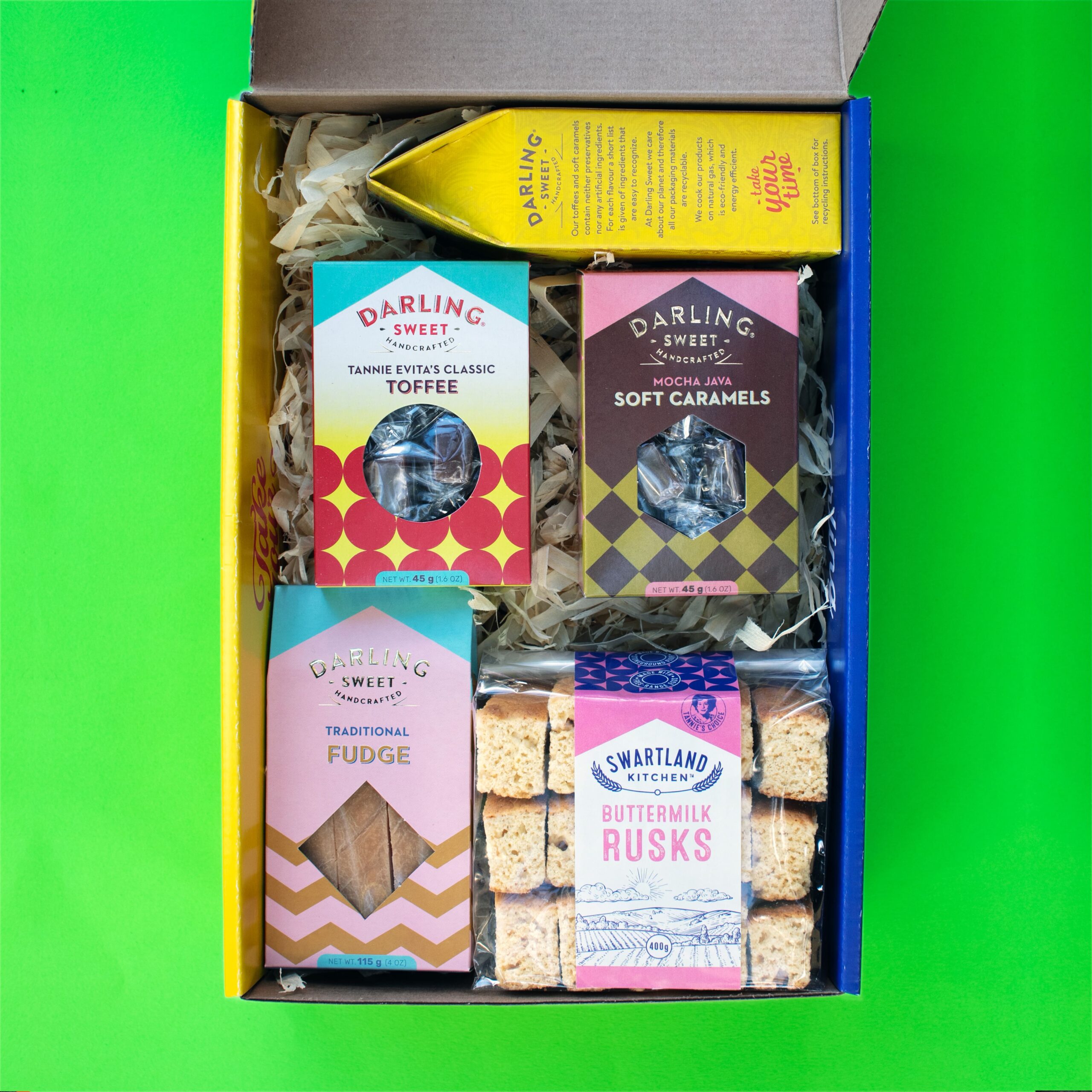 Treat someone special with Darling Sweet’s Hamper 6, a carefully curated gift set celebrating South African flavours. This hamper includes Evita Bezuidenhout’s Bossie Sikelela cookbook in Afrikaans, a 400g selection of Swartland Kitchen Rusks of your choice, two 45g Darling Sweet Toffees or Soft Caramels, one 150g Darling Sweet Toffee or Soft Caramel, and a 115g portion of our Traditional Fudge.