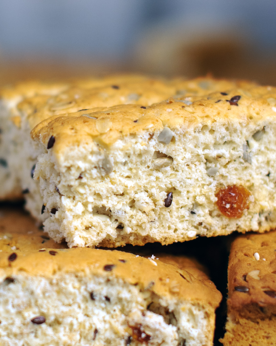 Stoneground cake wheat flour, Buttermilk (milk, cultures), Sweetener (Isomalt, Oligofructose), Oats, Vegetable oil (coconut kernel), Sunflower seeds, Maltodextrin, Salted Butter (3%), Free range eggs, Sultanas, Rising agent, Treacle, Linseeds, Sesame seeds, Pumpkin seeds, Salt.
